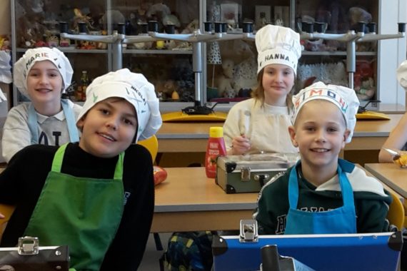 Die 1D hat in der letzten Semesterwoche ihre selbst genähten Schürzen gleich verwendet und mit dem Toastmaker leckere Toasts und einen Obstsalat zubereitet.