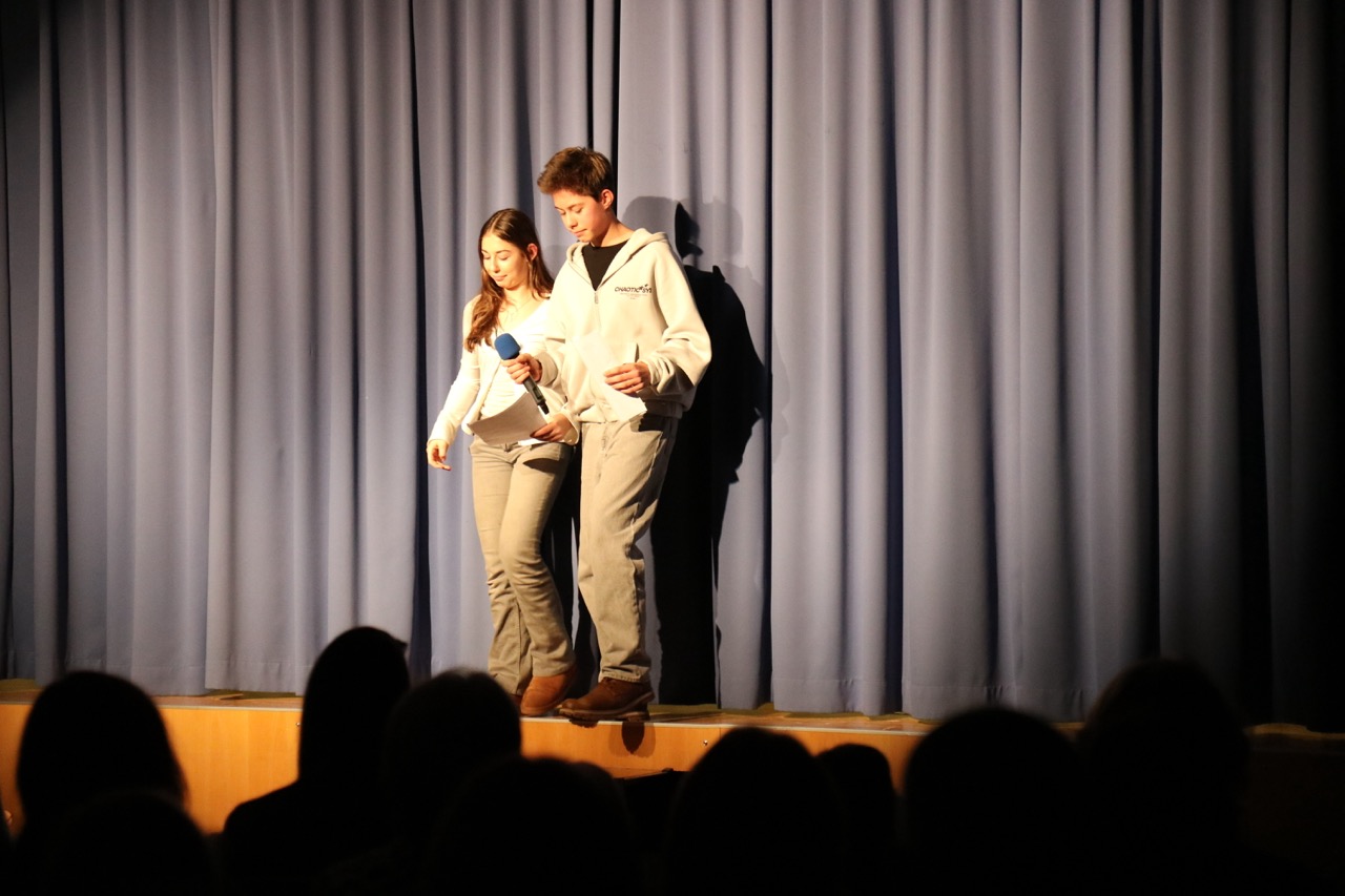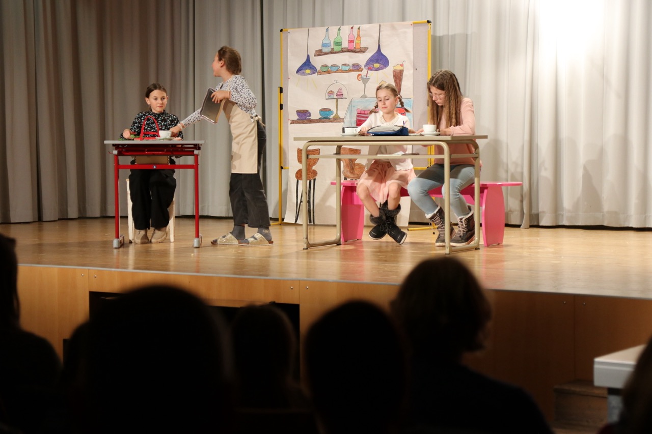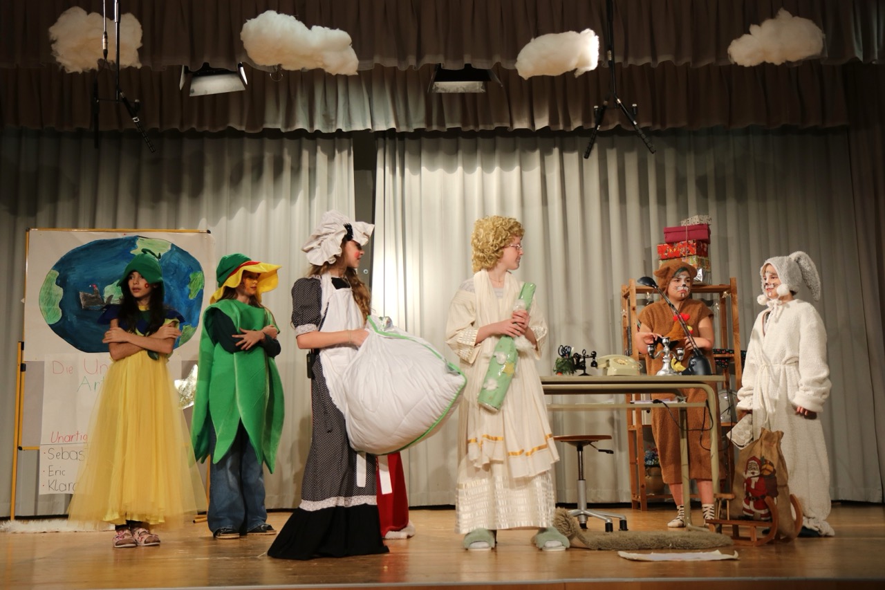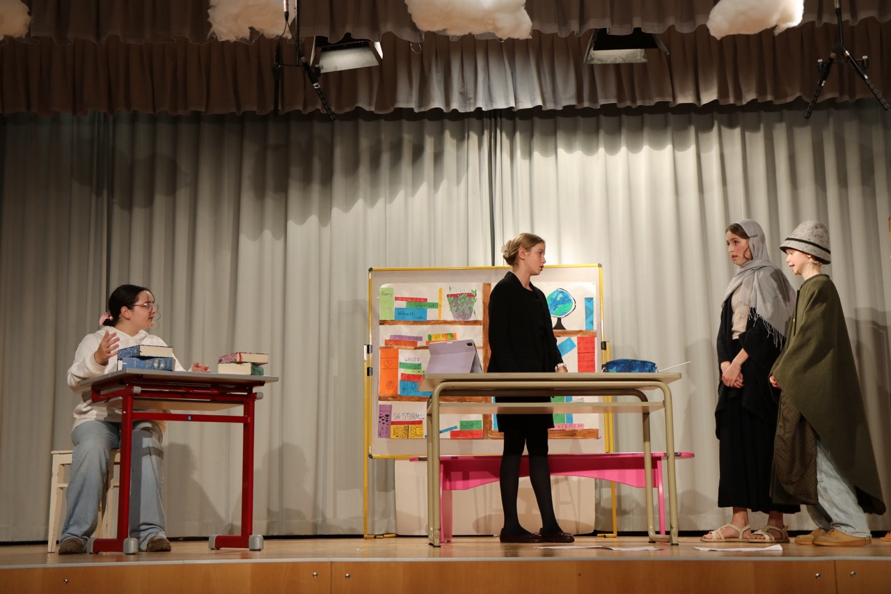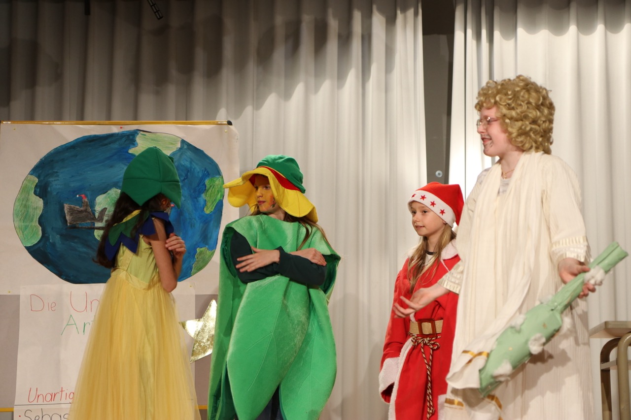 Die 1. Klassen eröffneten den Abend mit „Ein Computer für Petrus“ von Anne Bergmann. Darin versuchte der junge Gehilfe Compinius, den Himmel mit einem Computer besser zu organisieren – und brachte damit das himmlische Programm völlig durcheinander.