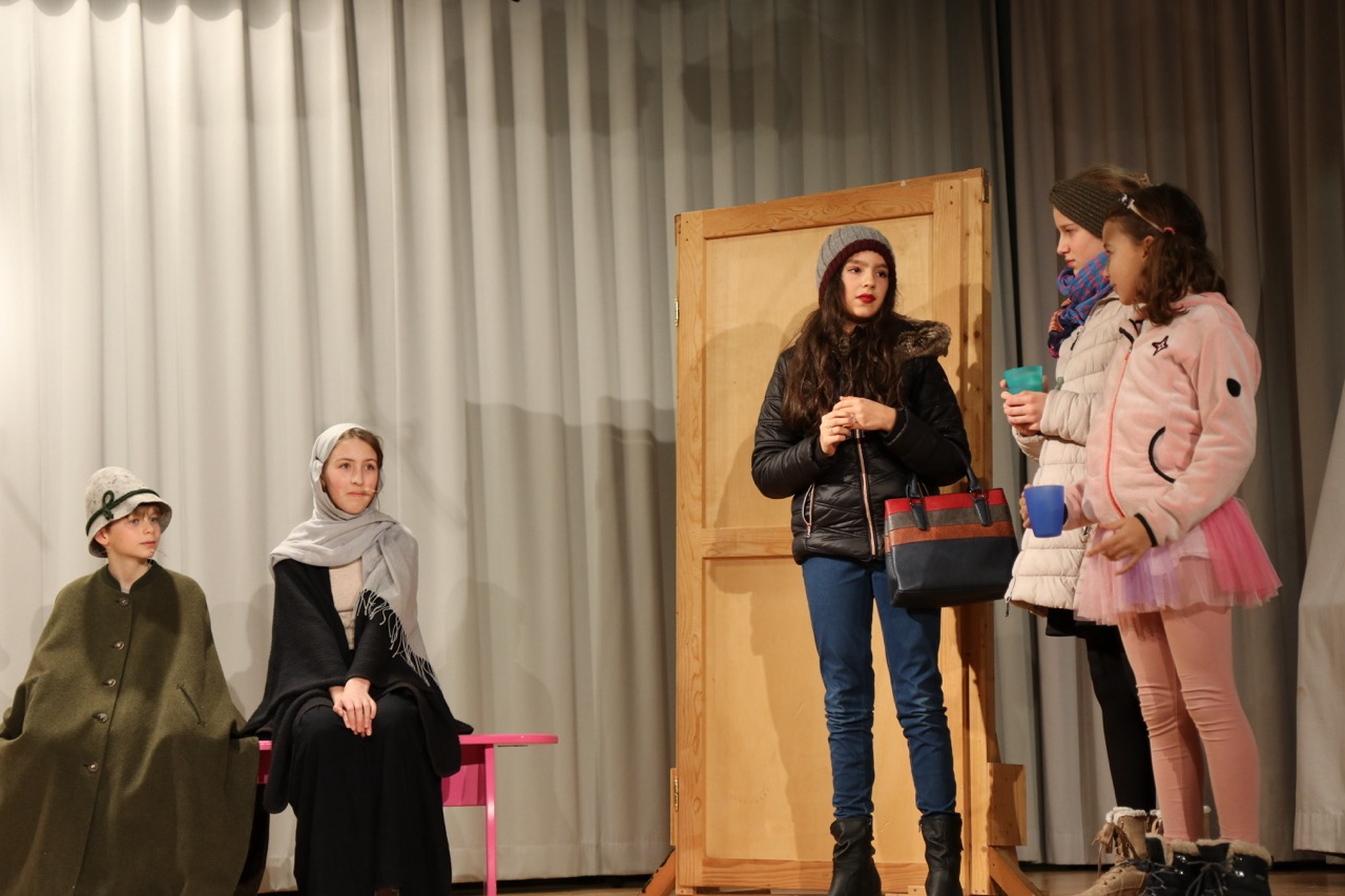 Danach präsentierten die 2. Klassen das Stück „Herbergsuche heute“ und vermittelten in teils selbst geschriebenen Szenen sehr eindrucksvoll, wie herausfordernd die Herbergsuche für Maria und Josef in unserer heutigen hektischen Zeit wohl wäre.